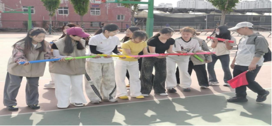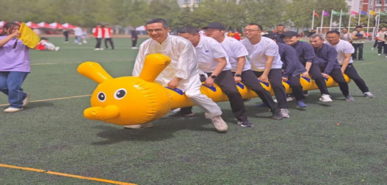 老师们跨坐“毛毛虫”,齐声喊号,步伐一致,奋力向前冲刺。
