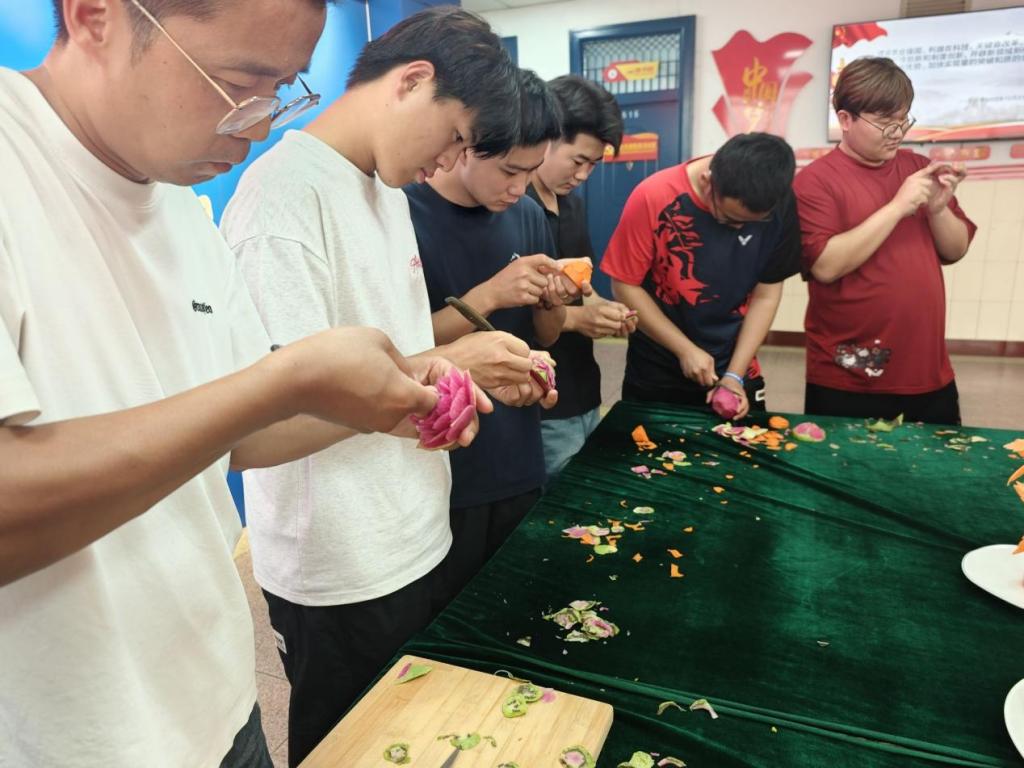 本次活动精心打造了三大特色板块,为师生们倾力呈现了一场沉浸式的雕刻艺术盛宴,令他们在艺术的海洋中尽情遨游,感受雕刻艺术的独特魅力。理论讲解环节中,行业资深雕刻艺术家化身“文化使者”,以通俗易懂的语言,生动讲述雕刻艺术的千年传承脉络、多元流派风格及精湛技艺体系,让员工们对这门传统艺术有了系统性认知;现场演示环节令人目不暇接,萝卜雕的精巧、萝卜雕的细腻、萝卜雕的奇绝轮番上阵。雕刻师以行云流水的刀法、别具匠心的构思,在各种颜色的萝卜间穿梭游走,忽而刀锋一转,牡丹花瓣层叠舒展,栩栩如生。每一件诞生于刀下的作品,都似被赋予了生命,引得在场师生屏息凝视,待佳作完成,热烈的赞叹与如雷掌声顿时响彻全场;实践操作环节则成为员工们展现创意的舞台,在雕刻师的悉心指导下,同学们手持刻刀,专注地在萝卜雕刻材料上勾勒线条、雕琢形态。尽管作品稍显稚嫩,但每一件都饱含着创作者的热情与匠心,充分展现出青春的无限创造力。