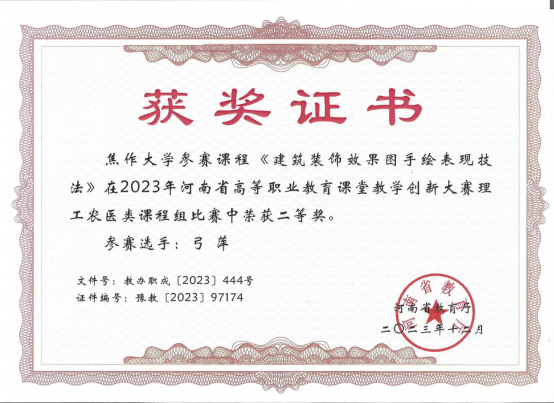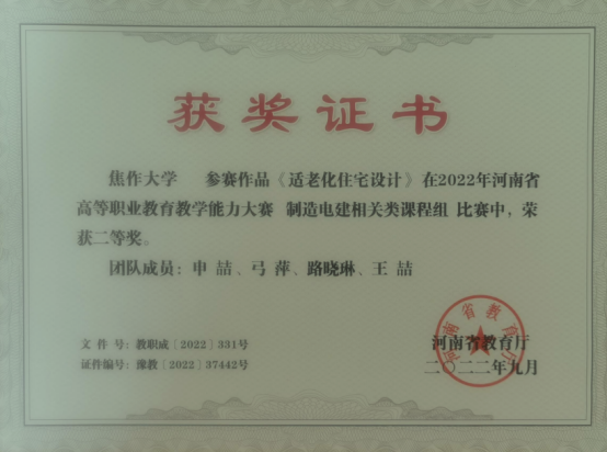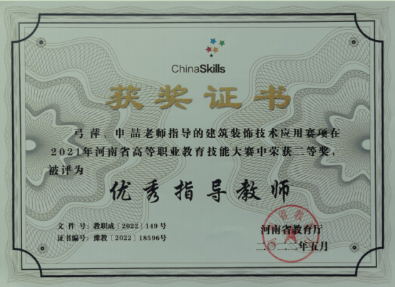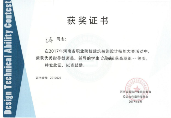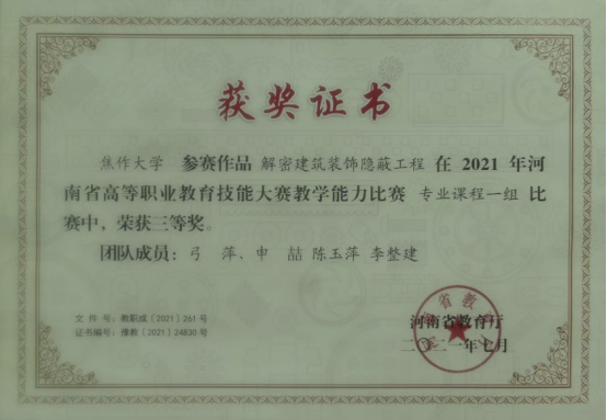 建筑装饰工程技术专业拥有一支结构合理的高素质双师型教师队伍,现有专任教师9人,博士1人,硕士7人,硕士学位教师比例达90%,副教授2人,专业带头人1人,省级骨干教师1人,省级课程思政名师1名;拥有省级精品在线开放课程2门,省级课程思政项目1项,省级教改项目1项,省级规划教材1部,国家级能者为师项目1项。专业教师多次在省级教学技能大赛中获得奖项,指导的员工也多次在河南省高等职业教育技能大赛中获得奖项。